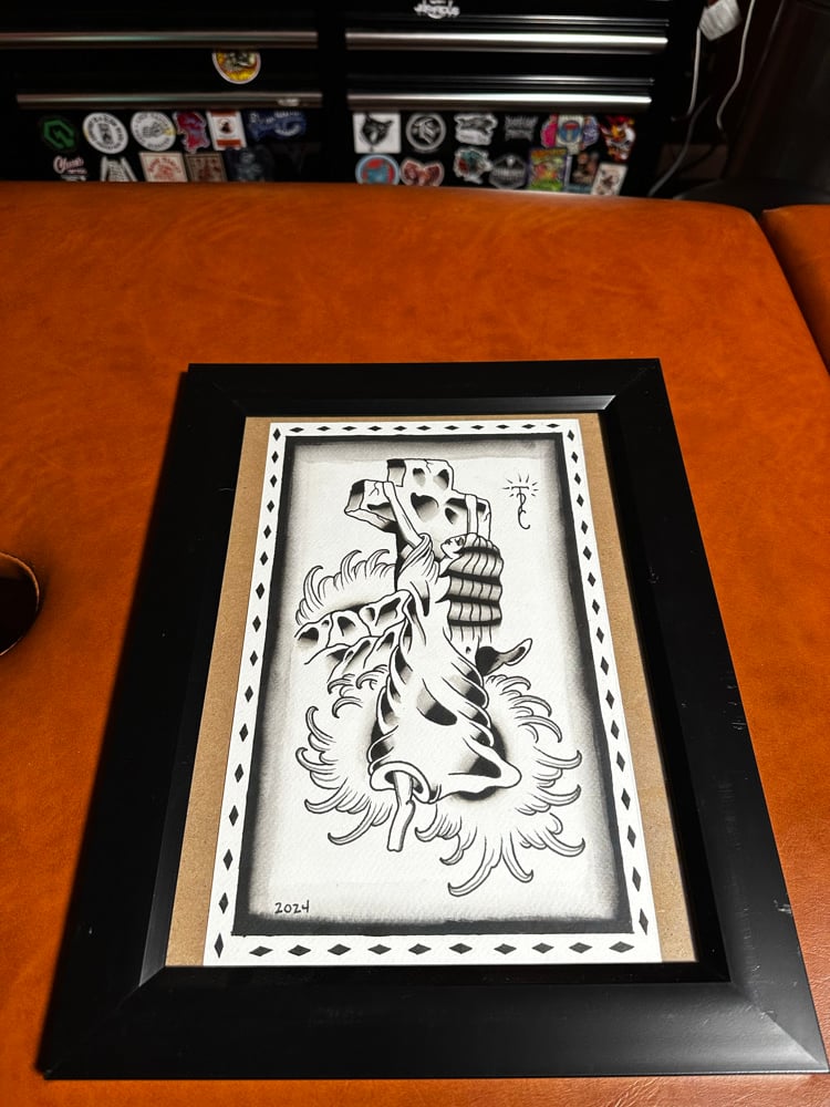 A hand designed, hand painted, one of a kind flash painting on arches watercolor paper. Great for tattoo memorabilia collectors or to add to your decor anywhere!
